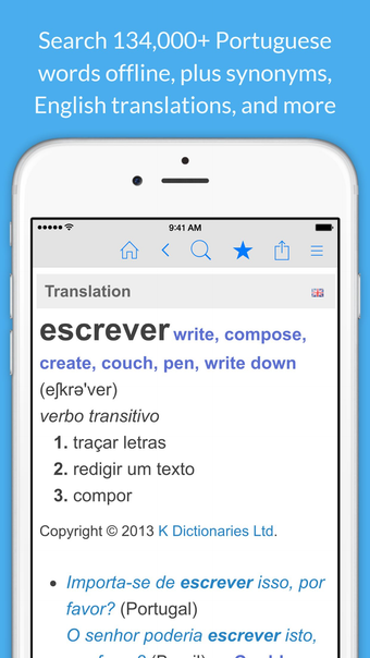 O Dicionário Português é um aplicativo educacional gratuito disponível para iPhone, que oferece um extenso conteúdo de definições, sinônimos e traduções do português para o inglês. Com mais dedefinições acessíveis offline, o usuário pode explorar verbos conjugados, frases de exemplo e realizar buscas avançadas. Além disso, o aplicativo permite a reprodução de pronúncias em áudio, facilitando o aprendizado da correta articulação das palavras.